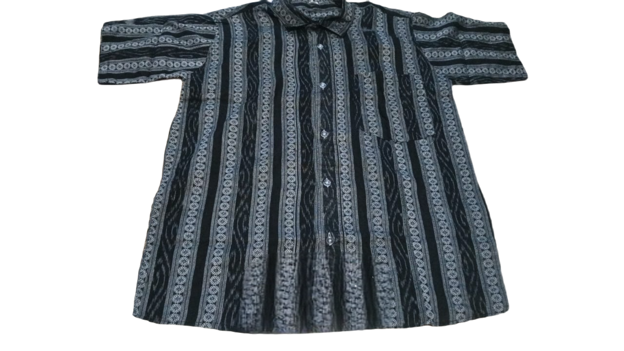 This is a Sambalpuri Shirt crafted from handloom-made cotton fabric. With a Black and Grey color stripe design and half sleeves, this is elegant, light-weight, and will be perfect for all occasions day outings.