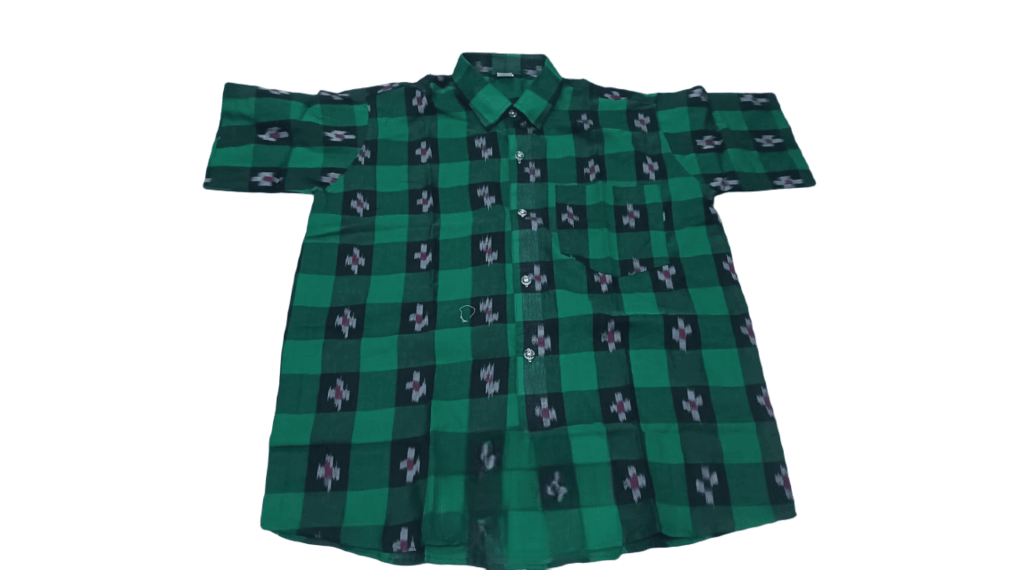 This is a Sambalpuri Shirt crafted from handloom-made cotton fabric. With a Green and Black color pasapali design and half sleeves, this is elegant, light-weight, and will be perfect for all occasions day outings.