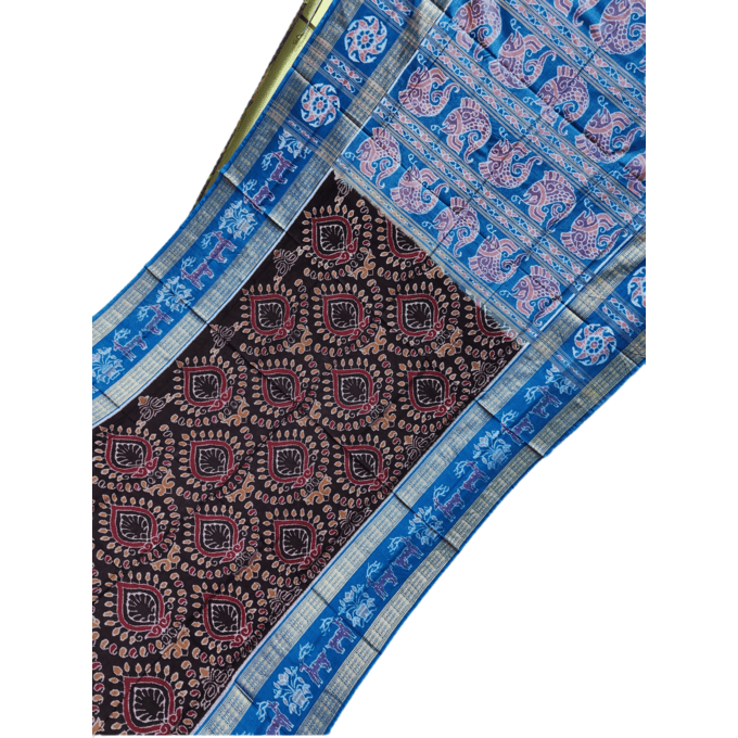 This is a Sambalpuri Saree crafted from fine handloom-made cotton fabric. With a Black and Maroon color body and a Blue color border with fish, deer, and tree carvings, this is elegant, light-weight, and will be perfect for festive wear and special occasions.