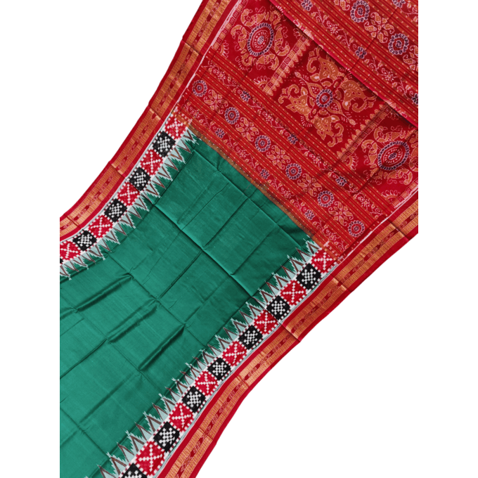 This is a Sambalpuri Saree crafted from fine handloom-made cotton fabric. With a Green color body and a Red color border with black and red alternative cross box carvings, this is elegant, light-weight, and will be perfect for festive wear and special occasions.